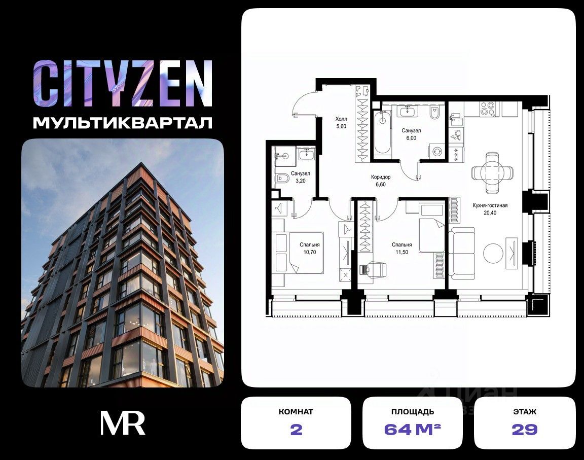 Продается 2-комнатная квартира от застройщика в жилом мультиквартале CITYZEN на 29-м этаже в корпусе #2 урбан-блока PARUS. Общая площадь лота составляет 64 м²