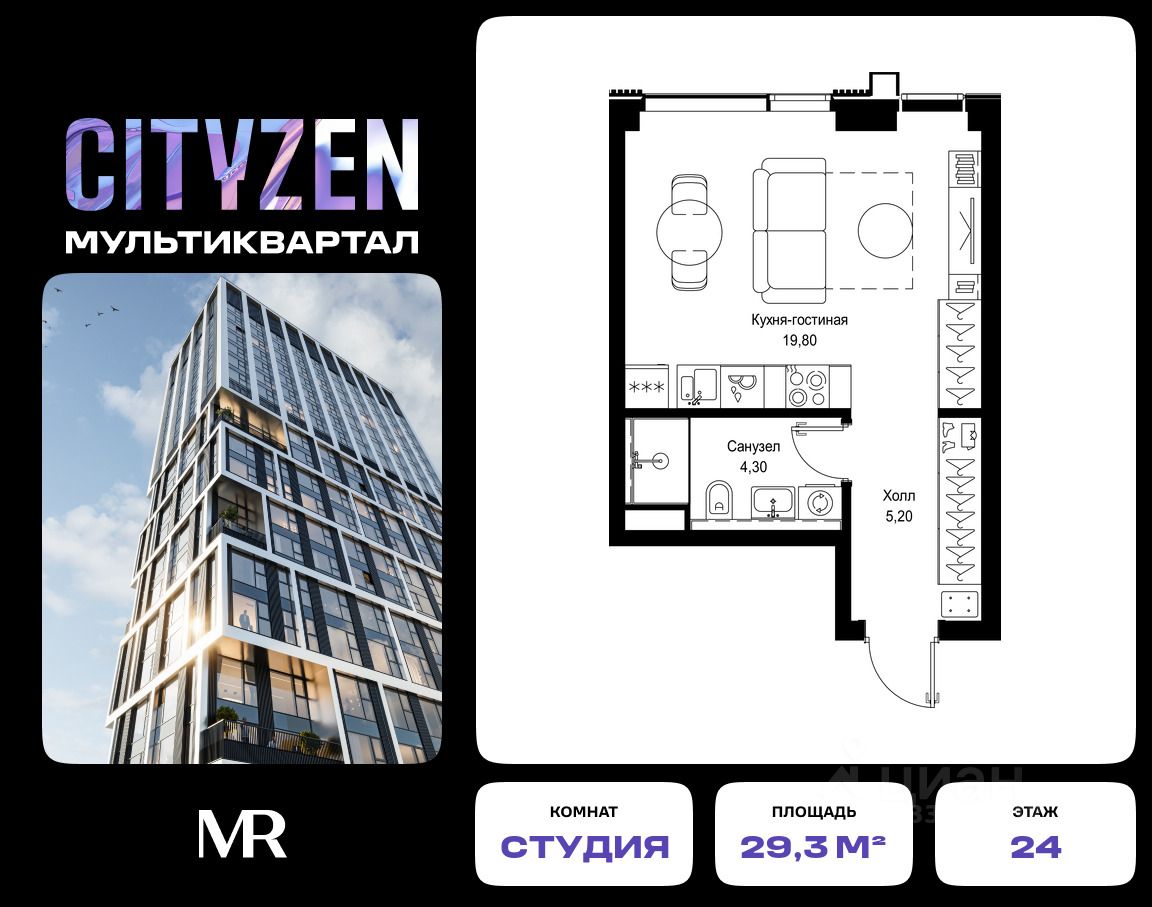 Продается студия от застройщика в жилом мультиквартале CITYZEN на 24-м этаже в корпусе #2 урбан-блока PARUS. Общая площадь лота составляет 29.30 м²