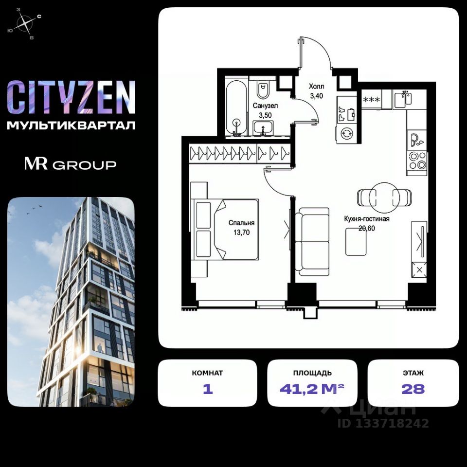 Продается 1-к квартира от застройщика в жилом мультиквартале CITYZEN на 28-м этаже в корпусе #2 урбан-блока PARUS. Общая площадь лота составляет 41.20 м²