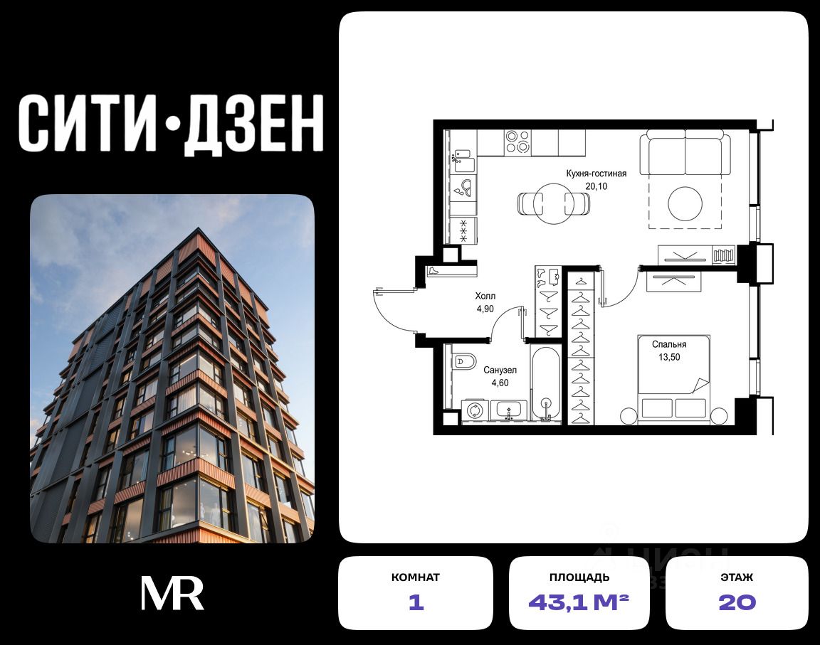 Продается 1-комнатная квартира от застройщика в жилом мультиквартале СИТИДЗЕН на 20-м этаже в корпусе #3. Общая площадь лота составляет 43.10 м²