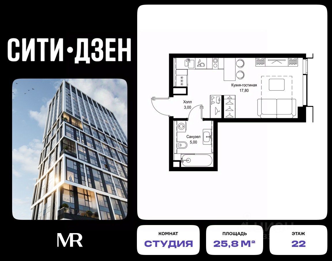 Продается студия от застройщика в жилом мультиквартале СИТИДЗЕН на 22-м этаже в корпусе #3 урбан-блока PARUS. Общая площадь лота составляет 25.80 м²