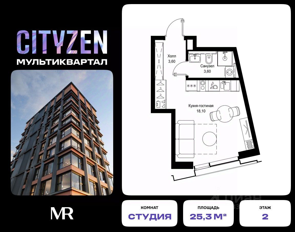 Продается студия от застройщика в жилом мультиквартале CITYZEN на 2-м этаже в корпусе #3 урбан-блока PARUS. Общая площадь лота составляет 25.30 м²