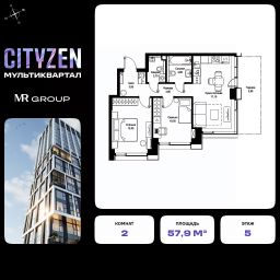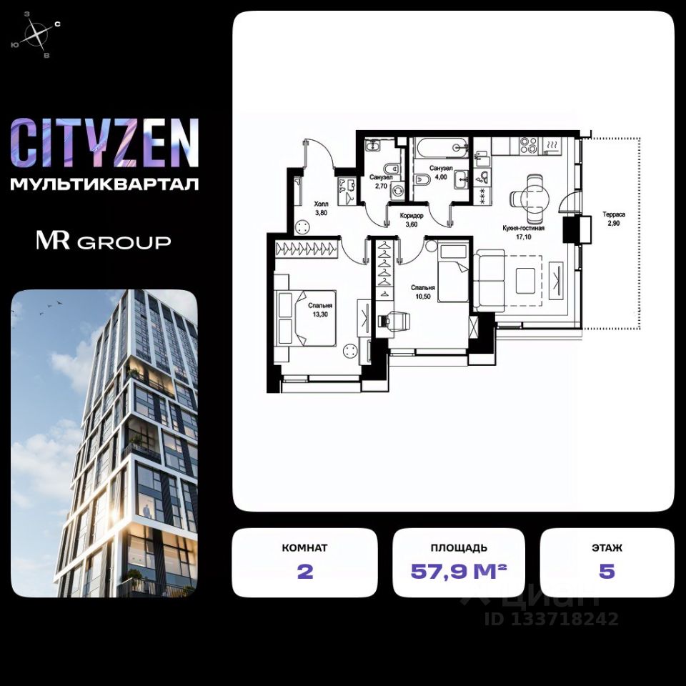 Продается 2-к квартира от застройщика в жилом мультиквартале CITYZEN на 5-м этаже в корпусе #3 урбан-блока PARUS. Общая площадь лота составляет 57.90 м²