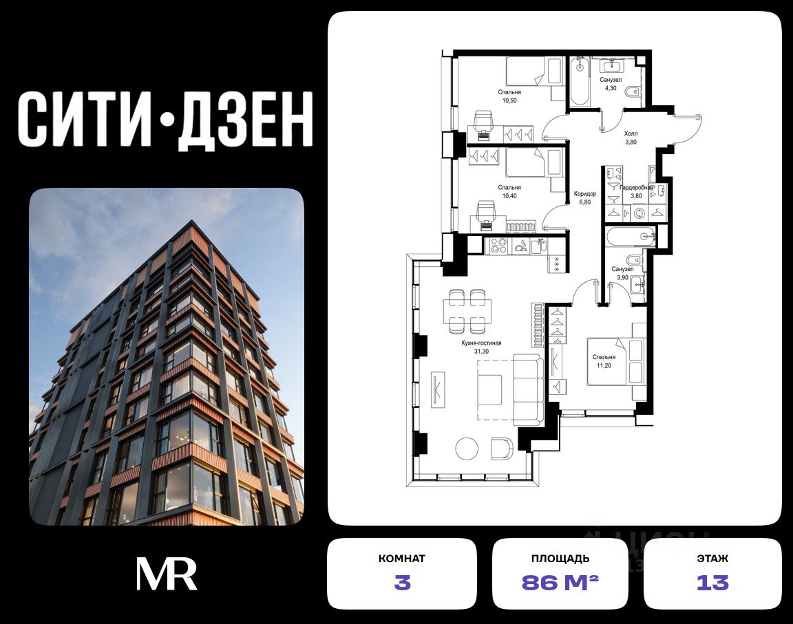 Продается 3-комнатная квартира от застройщика в жилом мультиквартале СИТИДЗЕН на 13-м этаже в корпусе #3. Общая площадь лота составляет 86 м²