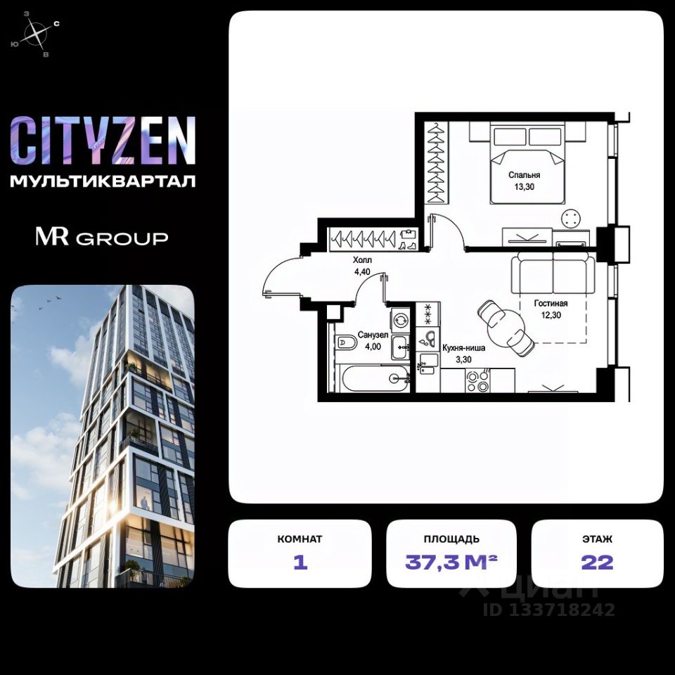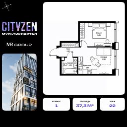 Продается 1-к квартира от застройщика в жилом мультиквартале CITYZEN на 22-м этаже в корпусе #3 урбан-блока PARUS. Общая площадь лота составляет 37.30 м²