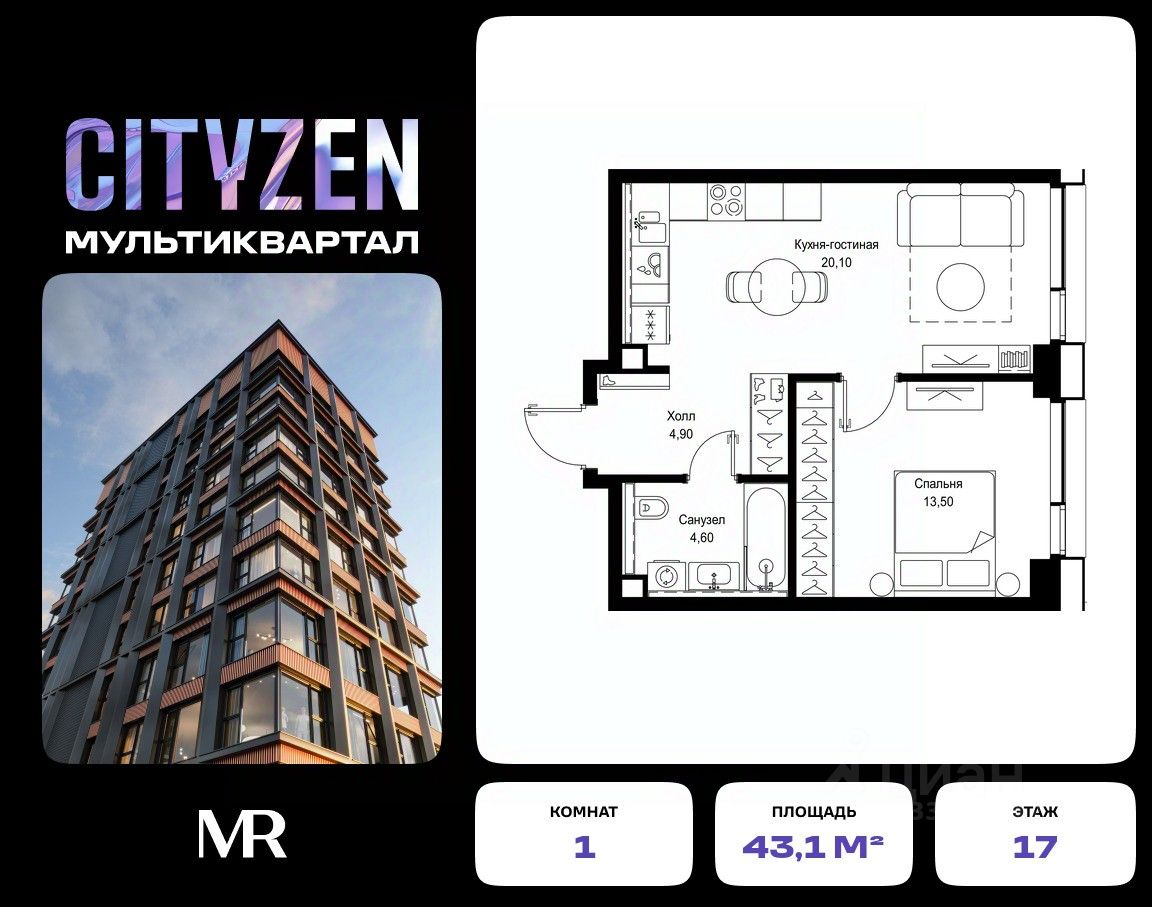 Продается 1-комнатная квартира от застройщика в жилом мультиквартале CITYZEN на 17-м этаже в корпусе #3 урбан-блока PARUS. Общая площадь лота составляет 43.10 м²