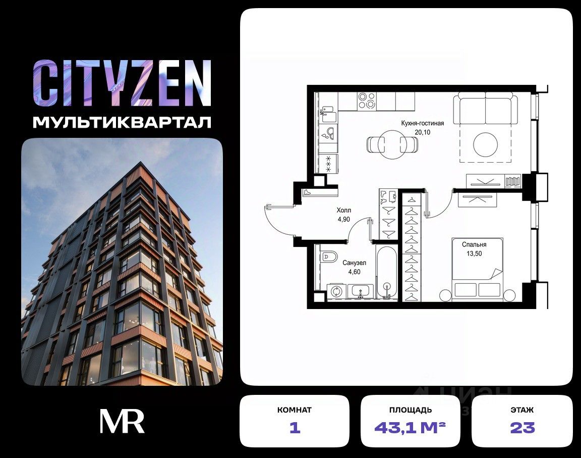 Продается 1-комнатная квартира от застройщика в жилом мультиквартале CITYZEN на 23-м этаже в корпусе #3 урбан-блока PARUS. Общая площадь лота составляет 43.10 м²