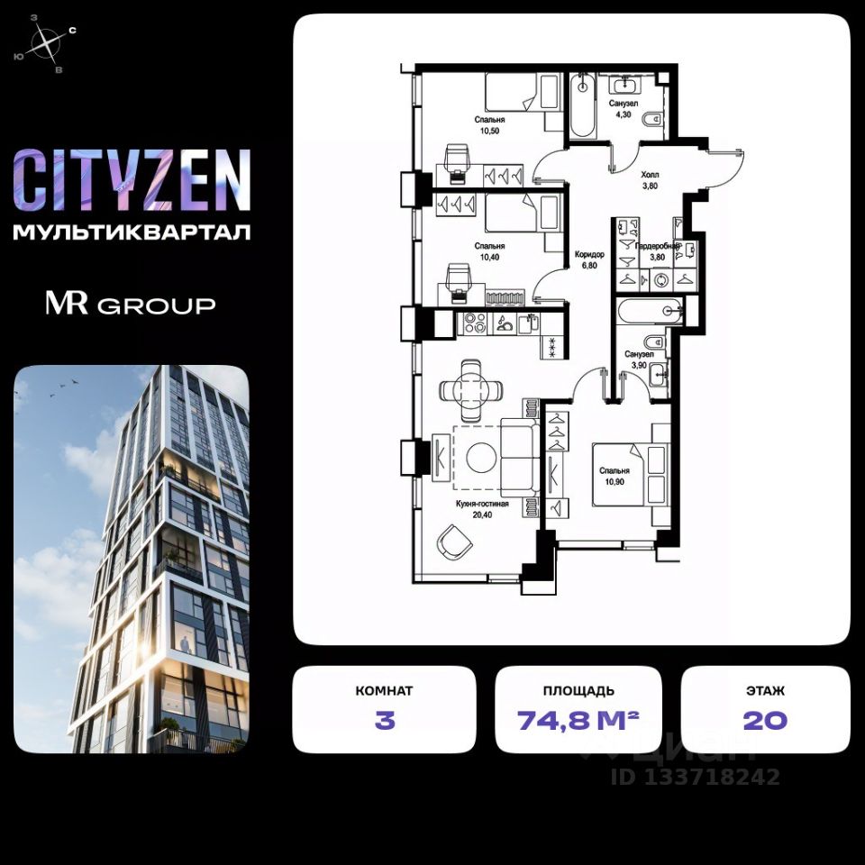Продается 3-к квартира от застройщика в жилом мультиквартале CITYZEN на 20-м этаже в корпусе #3 урбан-блока PARUS. Общая площадь лота составляет 74.80 м²