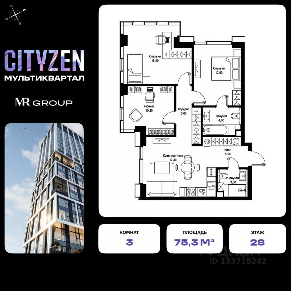 Продается 3-к квартира от застройщика в жилом мультиквартале CITYZEN на 28-м этаже в корпусе #3 урбан-блока PARUS. Общая площадь лота составляет 75.30 м²