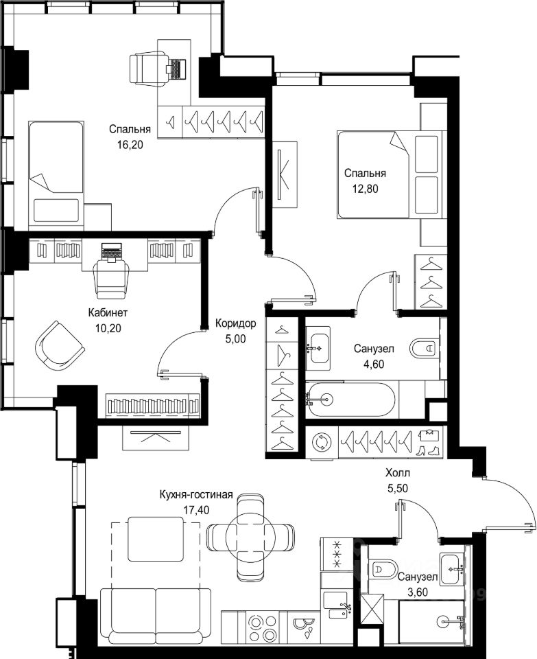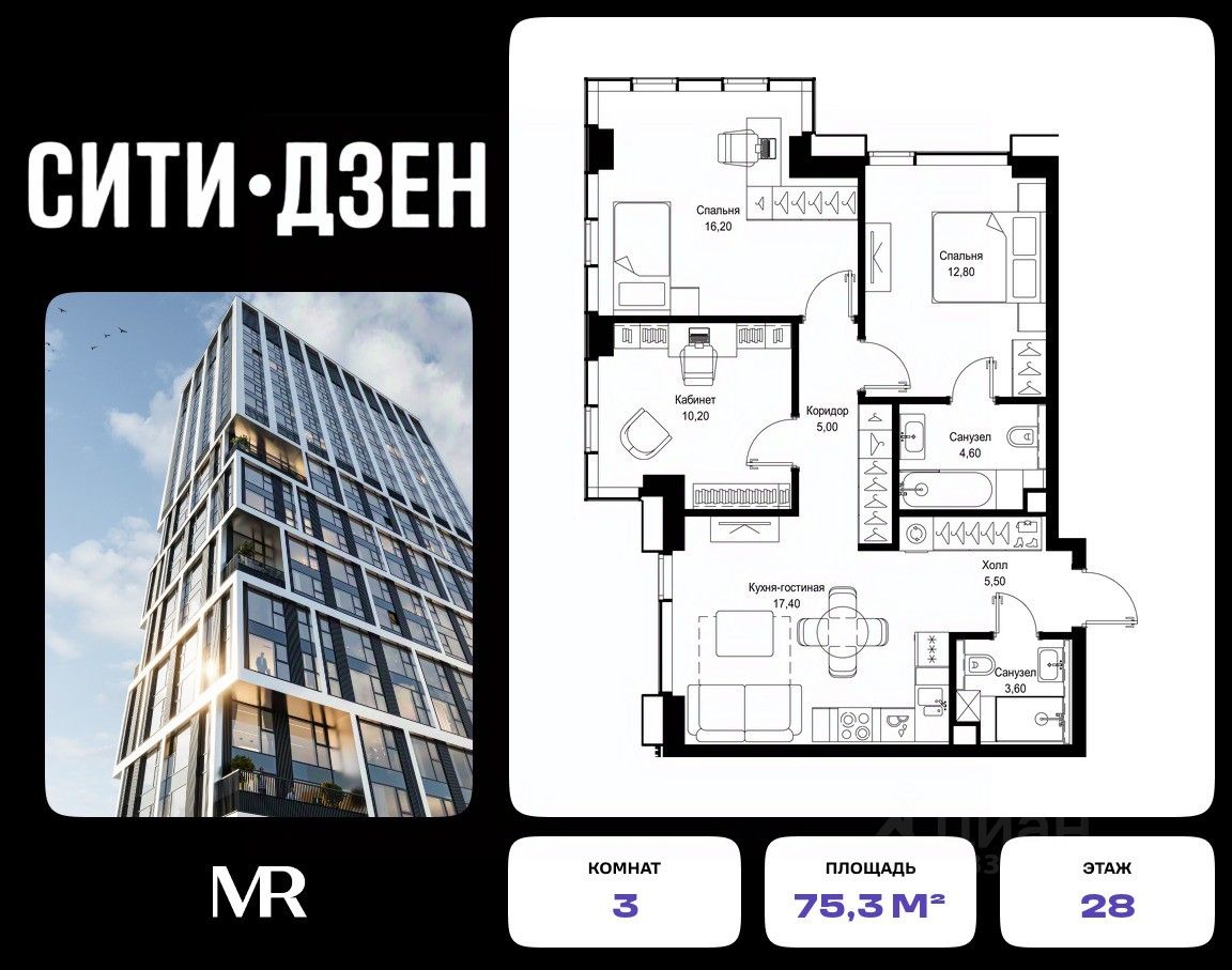 Продается 3-комнатная квартира от застройщика в жилом мультиквартале СИТИДЗЕН на 28-м этаже в корпусе #3. Общая площадь лота составляет 75.30 м²