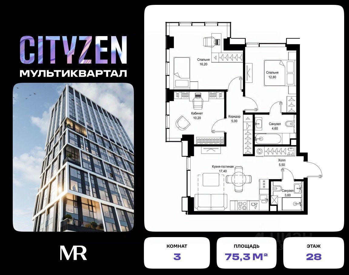 Продается 3-комнатная квартира от застройщика в жилом мультиквартале CITYZEN на 28-м этаже в корпусе #3 урбан-блока PARUS. Общая площадь лота составляет 75.30 м²