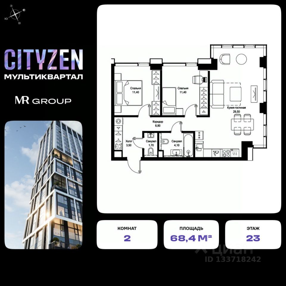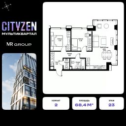 Продается 2-к квартира от застройщика в жилом мультиквартале CITYZEN на 23-м этаже в корпусе #3 урбан-блока PARUS. Общая площадь лота составляет 68.40 м²