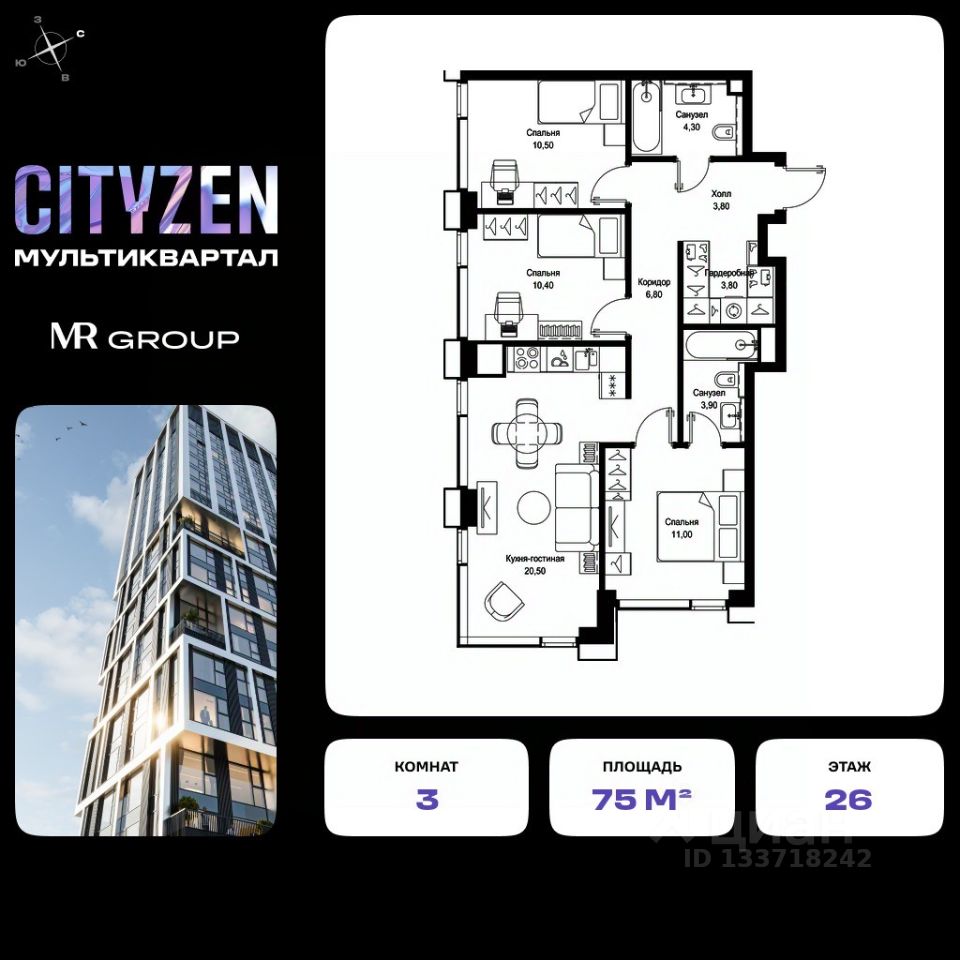 Продается 3-к квартира от застройщика в жилом мультиквартале CITYZEN на 26-м этаже в корпусе #3 урбан-блока PARUS. Общая площадь лота составляет 75 м²