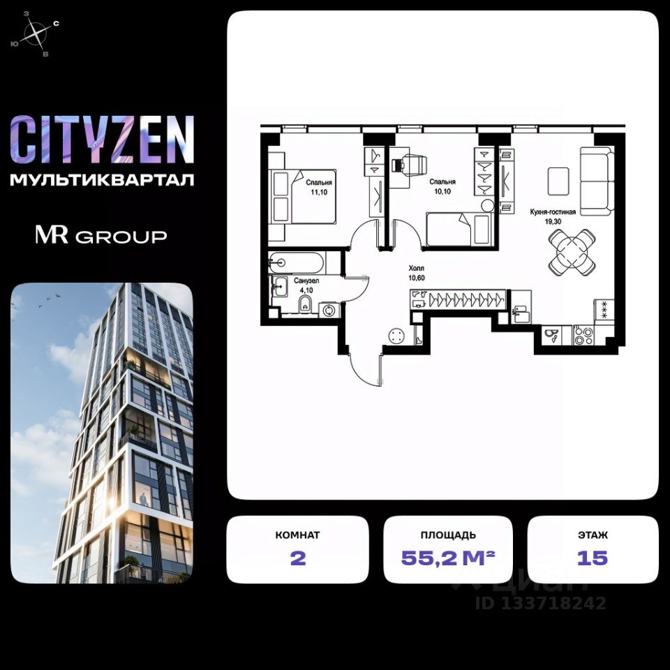 Продается 2-к квартира от застройщика в жилом мультиквартале CITYZEN на 15-м этаже в корпусе #6 урбан-блока VOLNA. Общая площадь лота составляет 55.20 м²