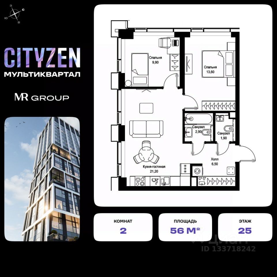 Продается 2-к квартира от застройщика в жилом мультиквартале CITYZEN на 25-м этаже в корпусе #6 урбан-блока VOLNA. Общая площадь лота составляет 56 м²