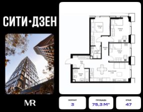 Продается 3-комнатная квартира от застройщика в жилом мультиквартале СИТИДЗЕН на 47-м этаже в корпусе #6. Общая площадь лота составляет 75.30 м²