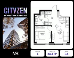 Продается 1-комнатная квартира от застройщика в жилом мультиквартале CITYZEN на 48-м этаже в корпусе #6 урбан-блока VOLNA. Общая площадь лота составляет 36.20 м²