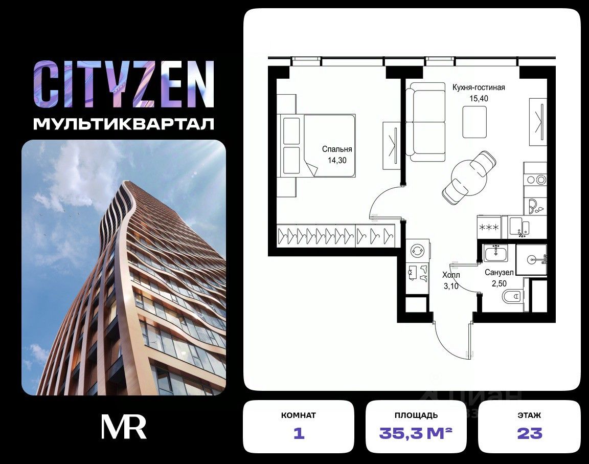 Продается 1-комнатная квартира от застройщика в жилом мультиквартале CITYZEN на 23-м этаже в корпусе #6 урбан-блока VOLNA. Общая площадь лота составляет 35.30 м²