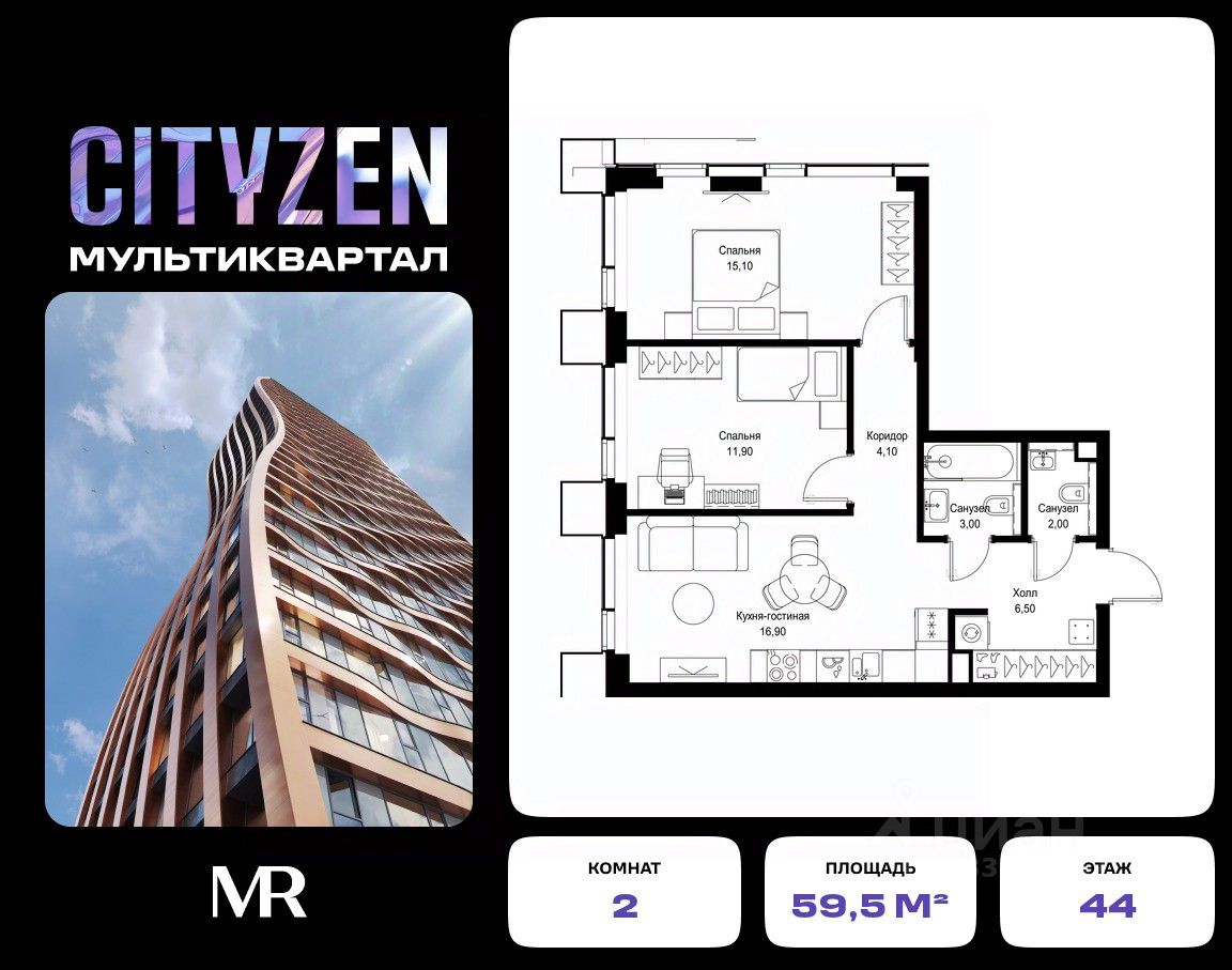 Продается 2-комнатная квартира от застройщика в жилом мультиквартале CITYZEN на 44-м этаже в корпусе #6 урбан-блока VOLNA. Общая площадь лота составляет 59.50 м²