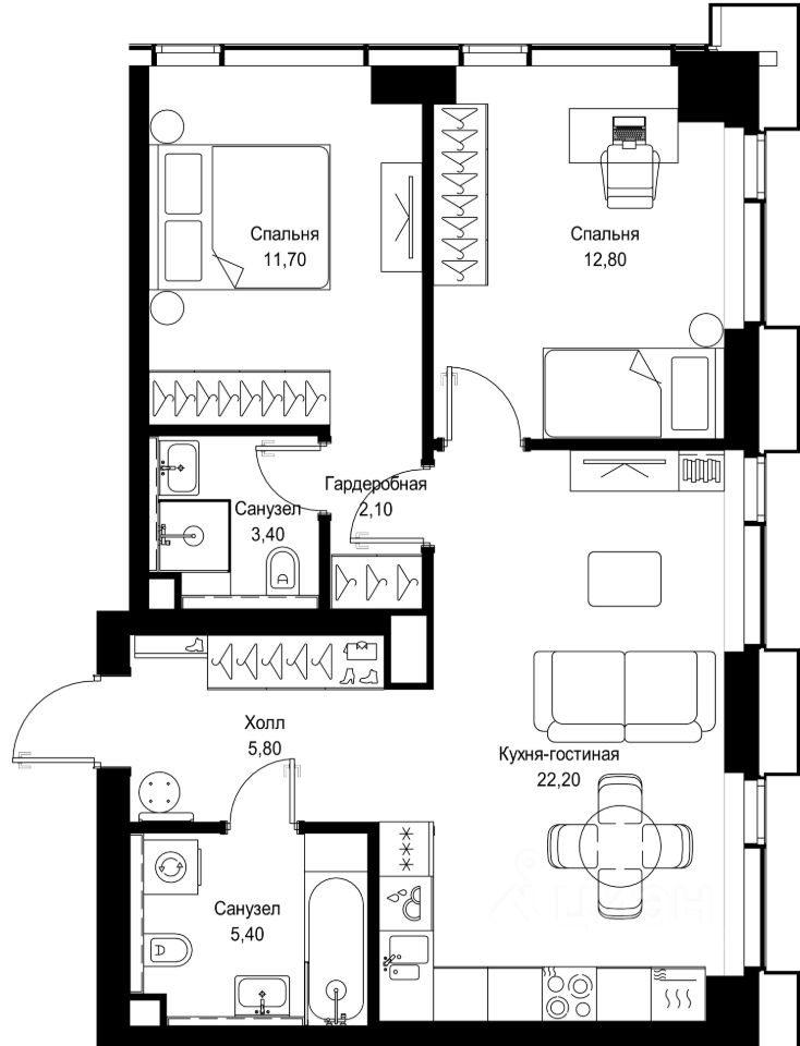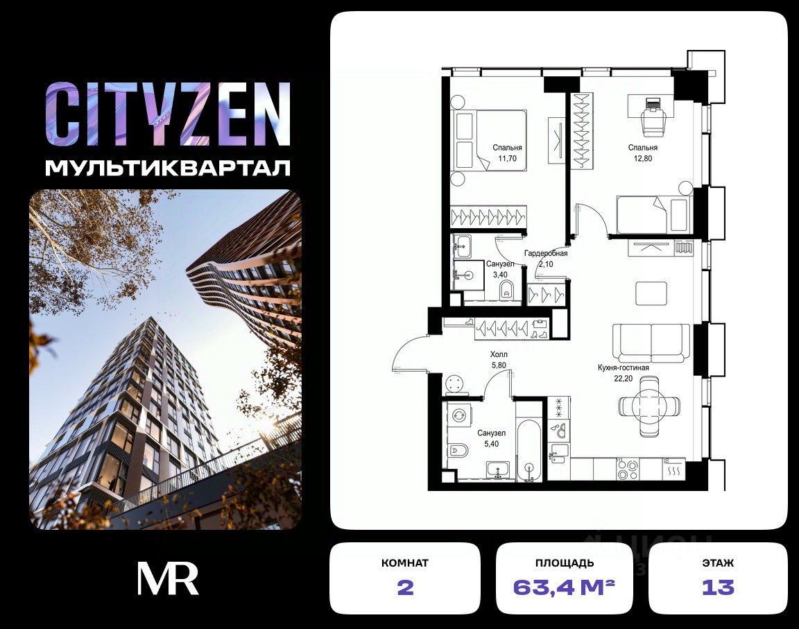 Продается 2-комнатная квартира от застройщика в жилом мультиквартале CITYZEN на 13-м этаже в корпусе #6 урбан-блока VOLNA. Общая площадь лота составляет 63.40 м²