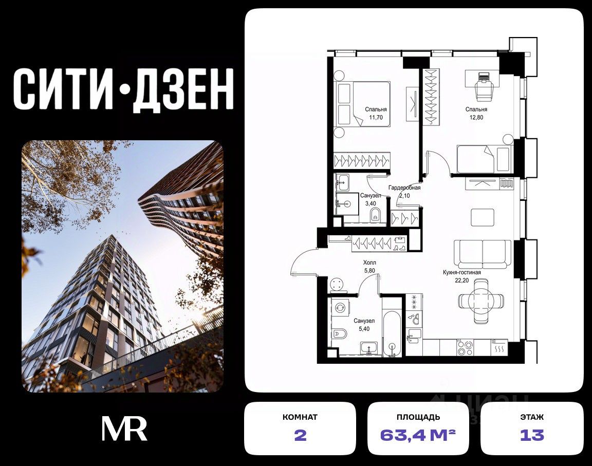 Продается 2-комнатная квартира от застройщика в жилом мультиквартале СИТИДЗЕН на 13-м этаже в корпусе #6. Общая площадь лота составляет 63.40 м²