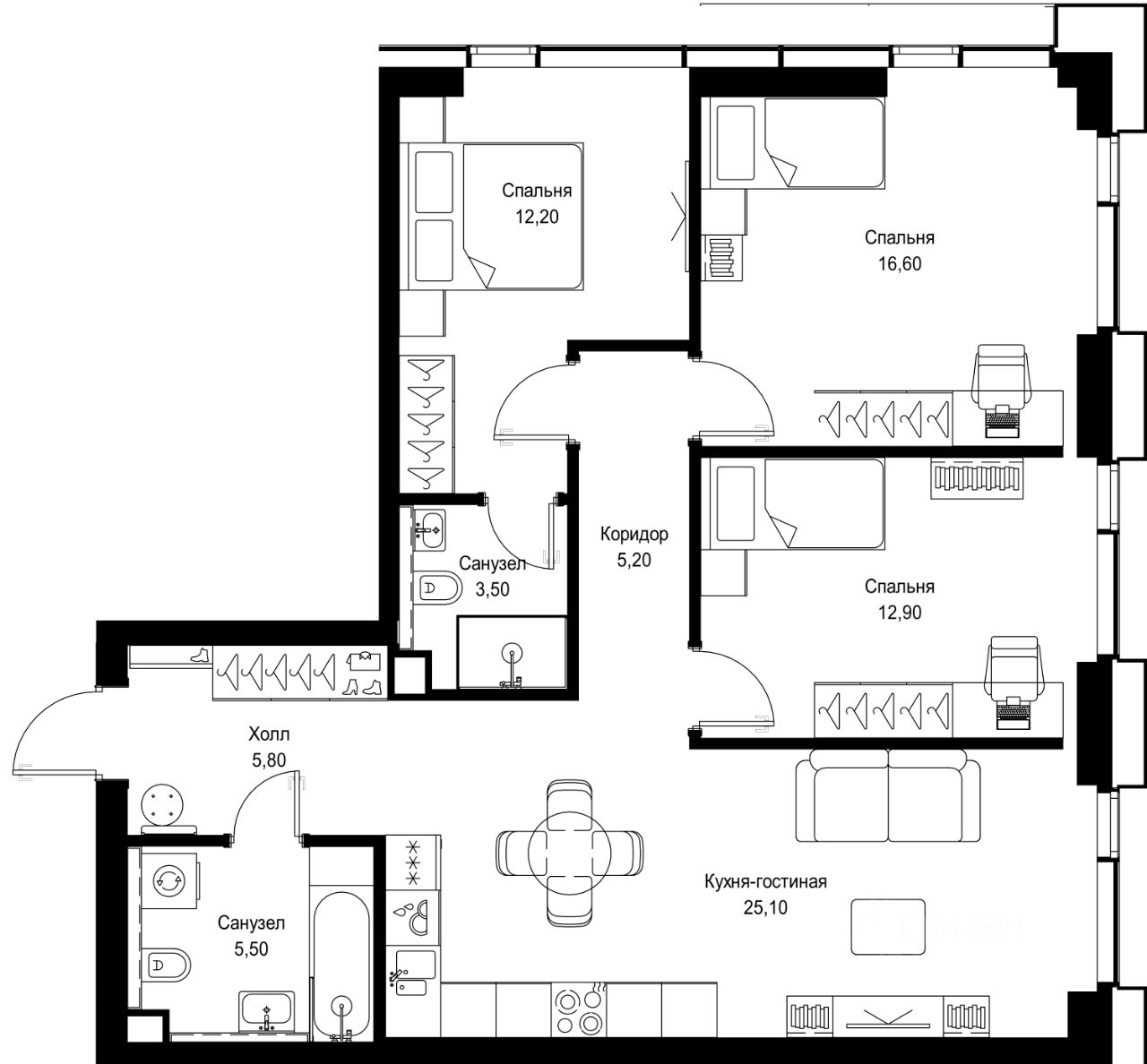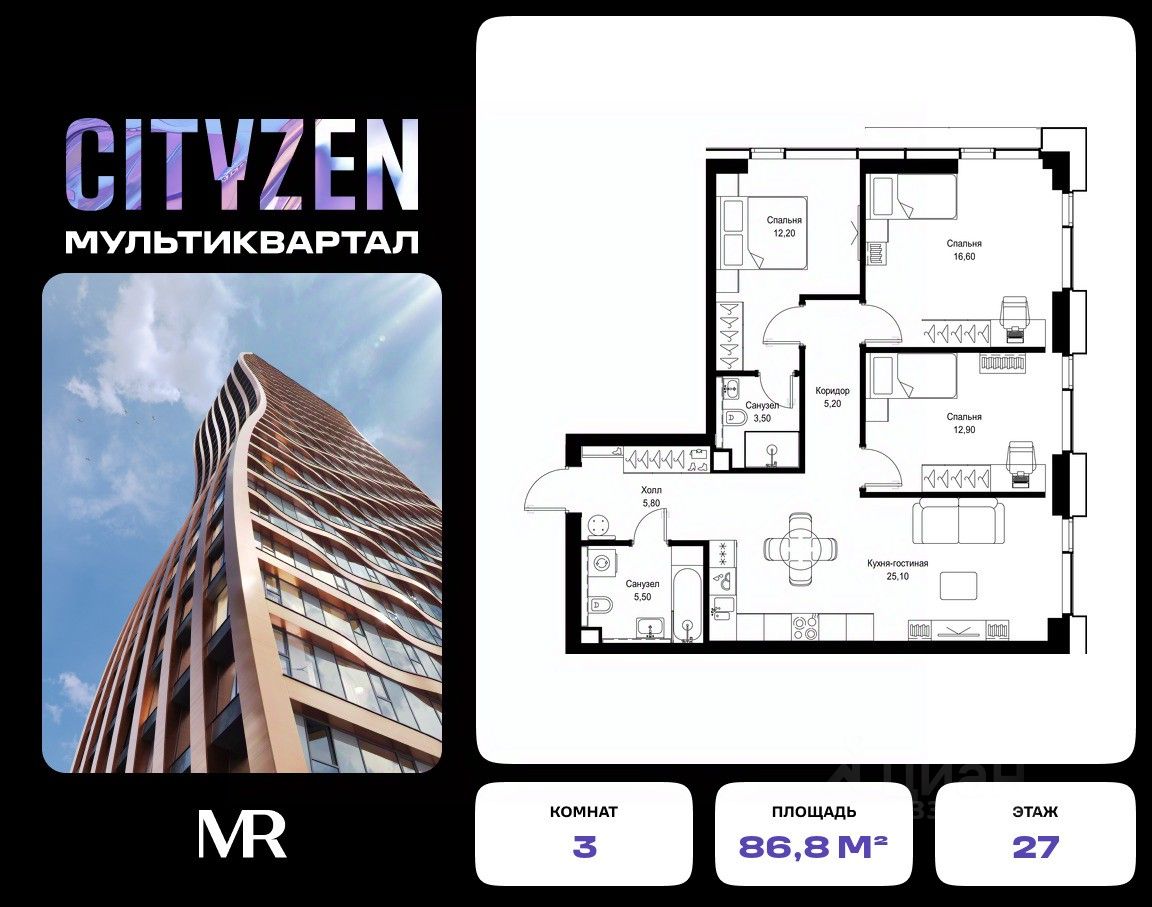 Продается 3-комнатная квартира от застройщика в жилом мультиквартале CITYZEN на 27-м этаже в корпусе #6 урбан-блока VOLNA. Общая площадь лота составляет 86.80 м²