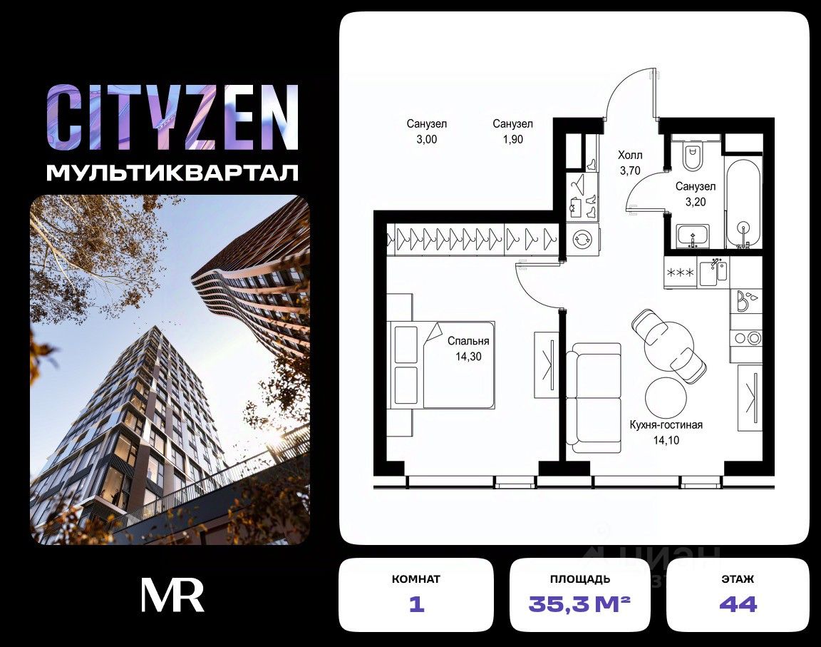 Продается 1-комнатная квартира от застройщика в жилом мультиквартале CITYZEN на 44-м этаже в корпусе #6 урбан-блока VOLNA. Общая площадь лота составляет 35.30 м²