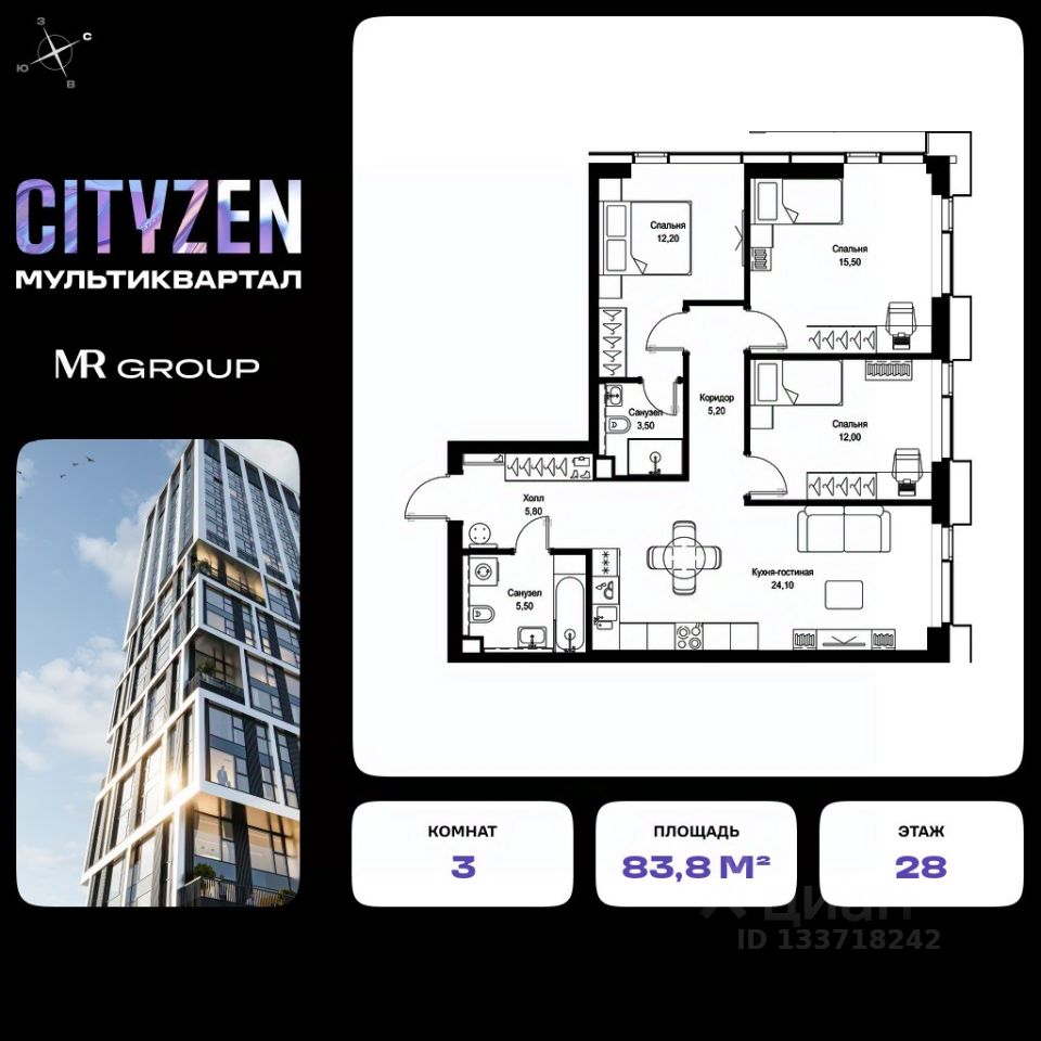 Продается 3-к квартира от застройщика в жилом мультиквартале CITYZEN на 28-м этаже в корпусе #6 урбан-блока VOLNA. Общая площадь лота составляет 83.80 м²