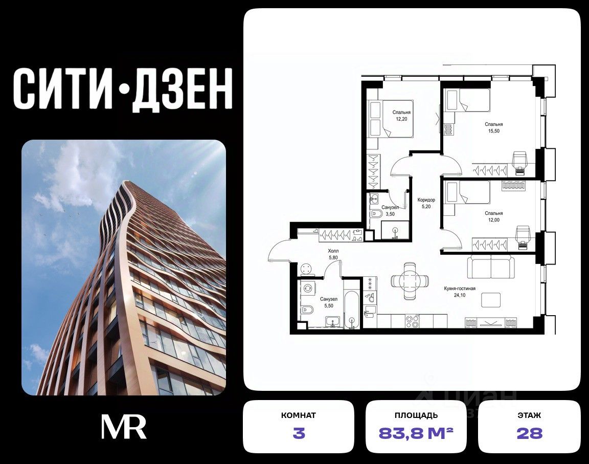 Продается 3-комнатная квартира от застройщика в жилом мультиквартале СИТИДЗЕН на 28-м этаже в корпусе #6 урбан-блока VOLNA. Общая площадь лота составляет 83.80 м²
