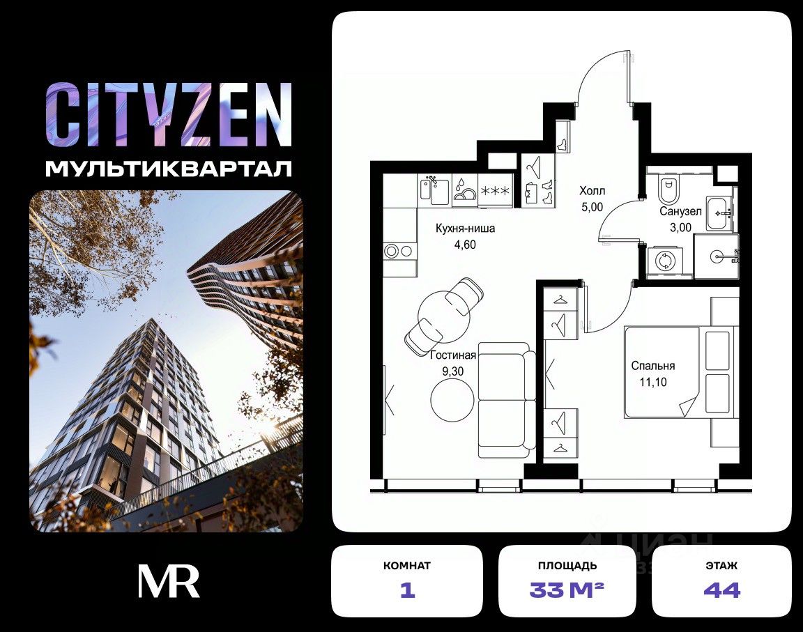 Продается 1-комнатная квартира от застройщика в жилом мультиквартале CITYZEN на 44-м этаже в корпусе #6 урбан-блока VOLNA. Общая площадь лота составляет 33 м²