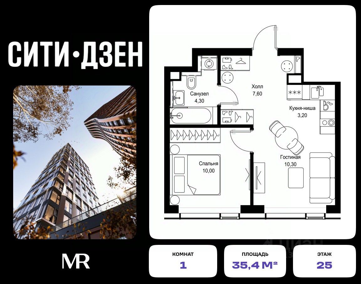 Продается 1-комнатная квартира от застройщика в жилом мультиквартале СИТИДЗЕН на 25-м этаже в корпусе #6 урбан-блока VOLNA. Общая площадь лота составляет 35.40 м²