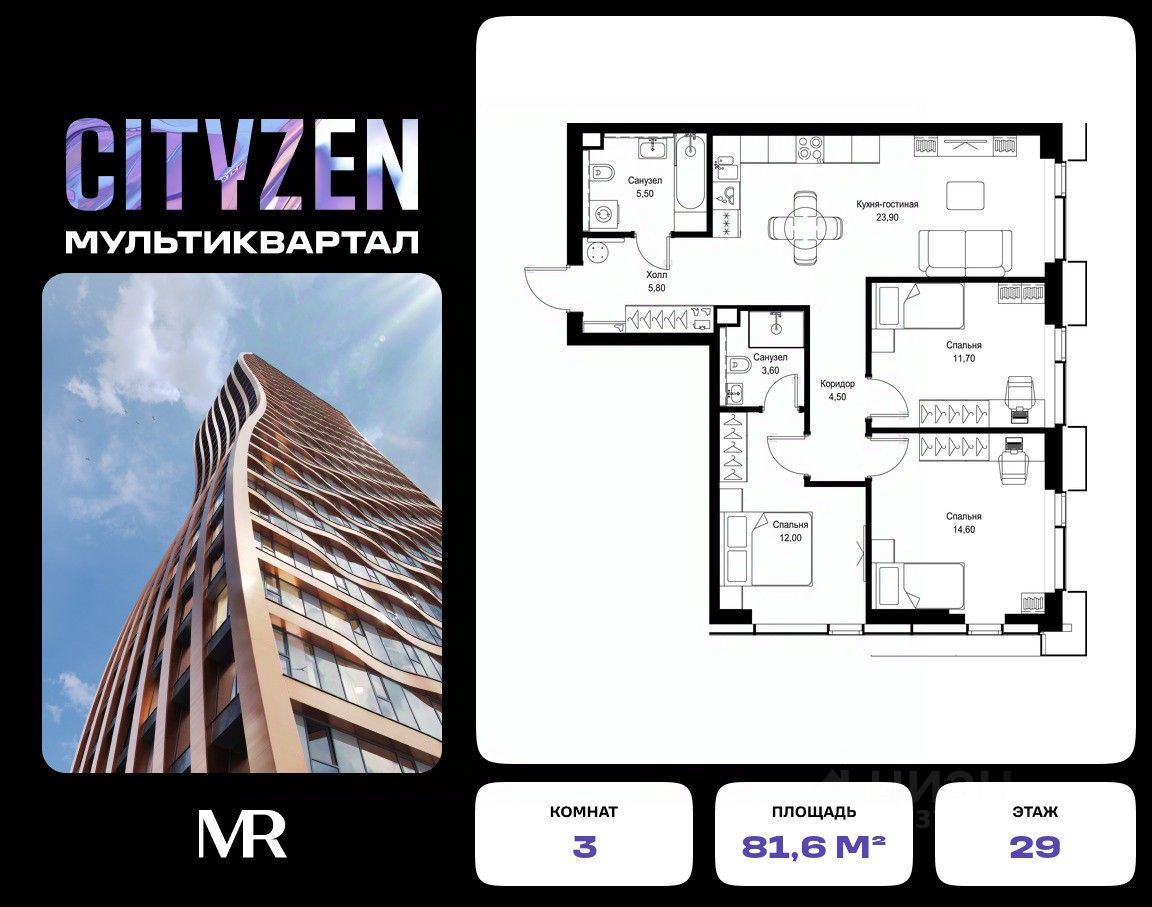 Продается 3-комнатная квартира от застройщика в жилом мультиквартале CITYZEN на 29-м этаже в корпусе #6 урбан-блока VOLNA. Общая площадь лота составляет 81.60 м²