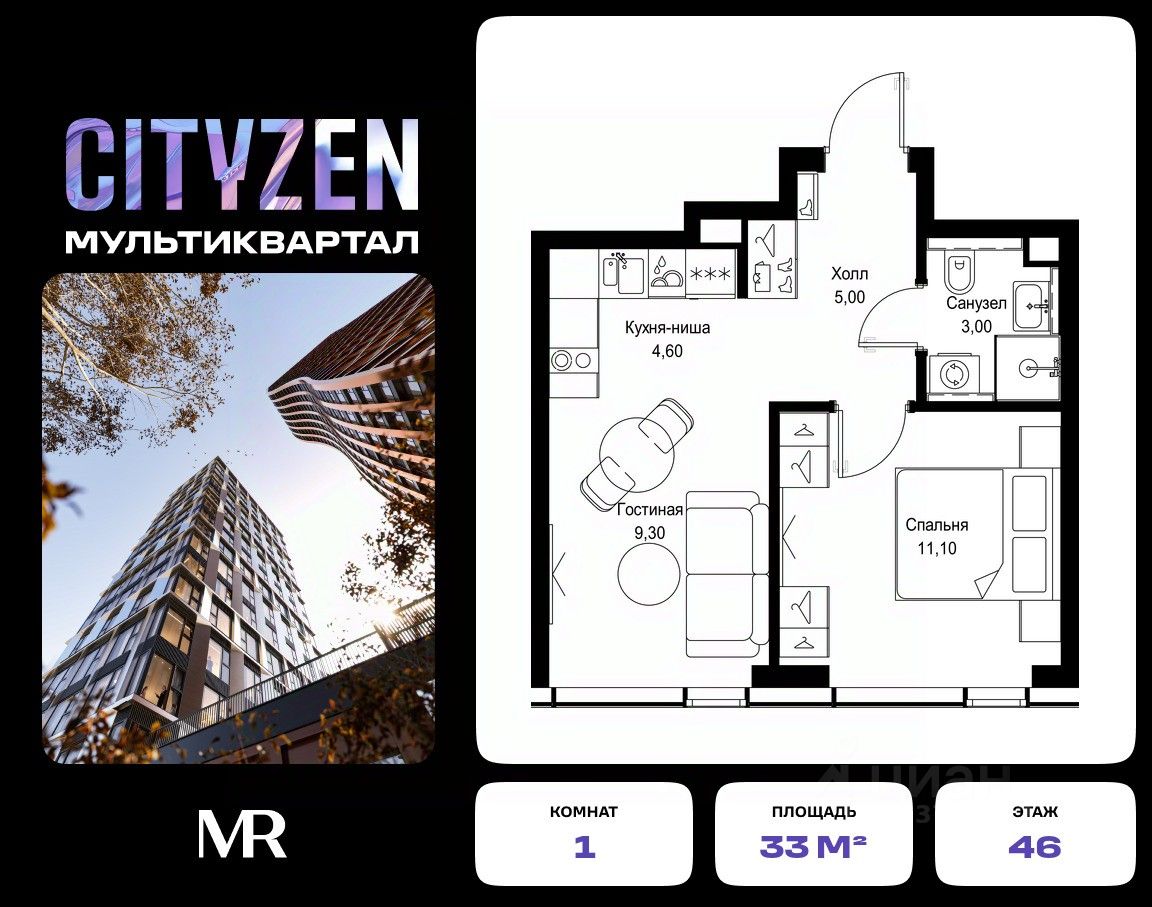 Продается 1-комнатная квартира от застройщика в жилом мультиквартале CITYZEN на 46-м этаже в корпусе #6 урбан-блока VOLNA. Общая площадь лота составляет 33 м²