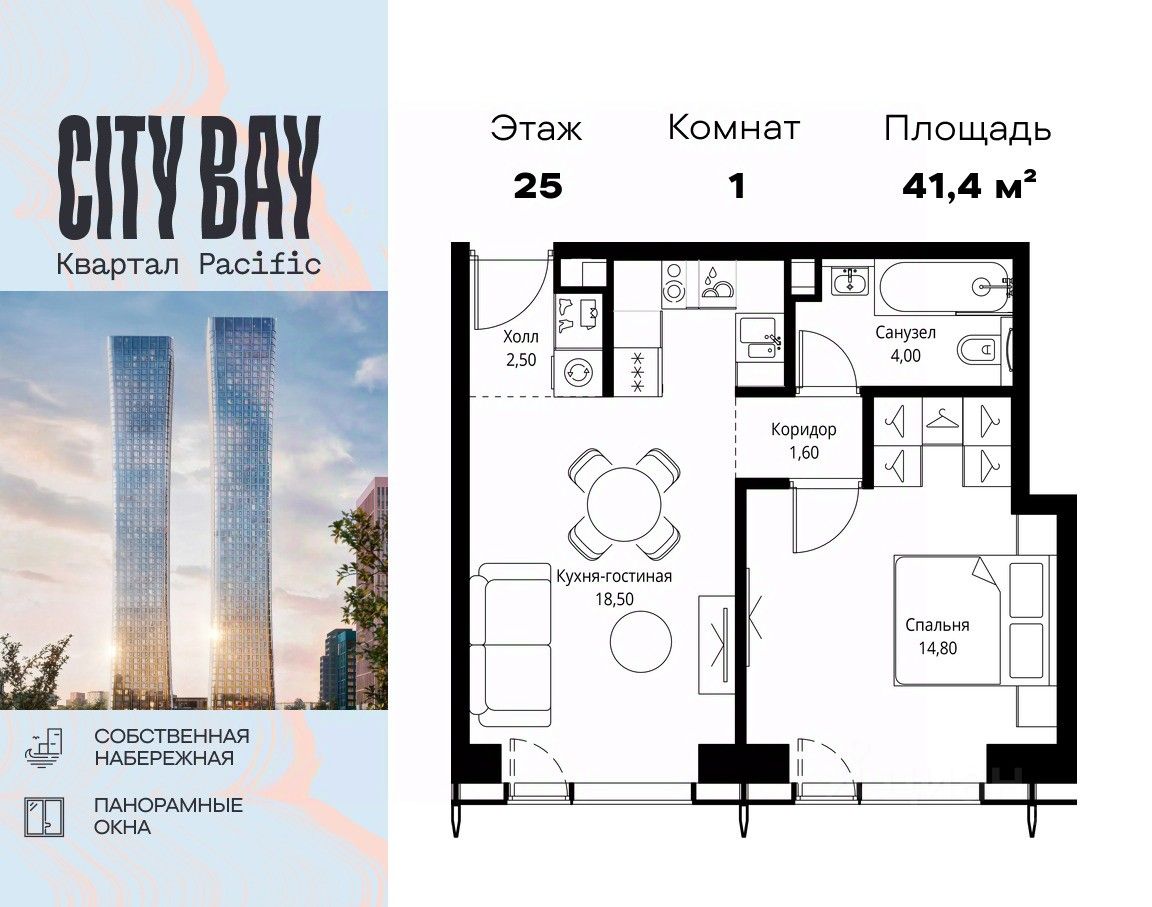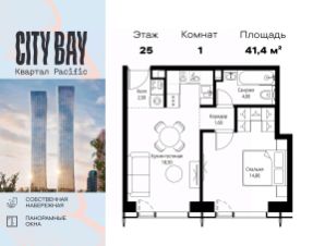 Продаётся 1-комнатная квартира общей площадью 41.40 м² без отделки в ЖК City Вау, квартале Pacific, на 25-м этаже 59 этажного дома.