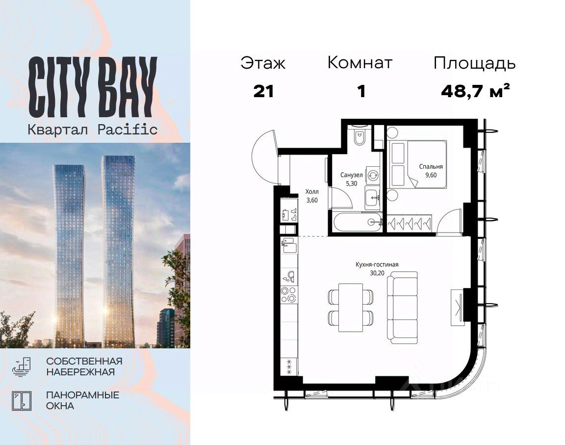 Продаётся 1-комнатная квартира общей площадью 48.70 м² без отделки в ЖК City Вау, квартале Pacific, на 21-м этаже 59 этажного дома.