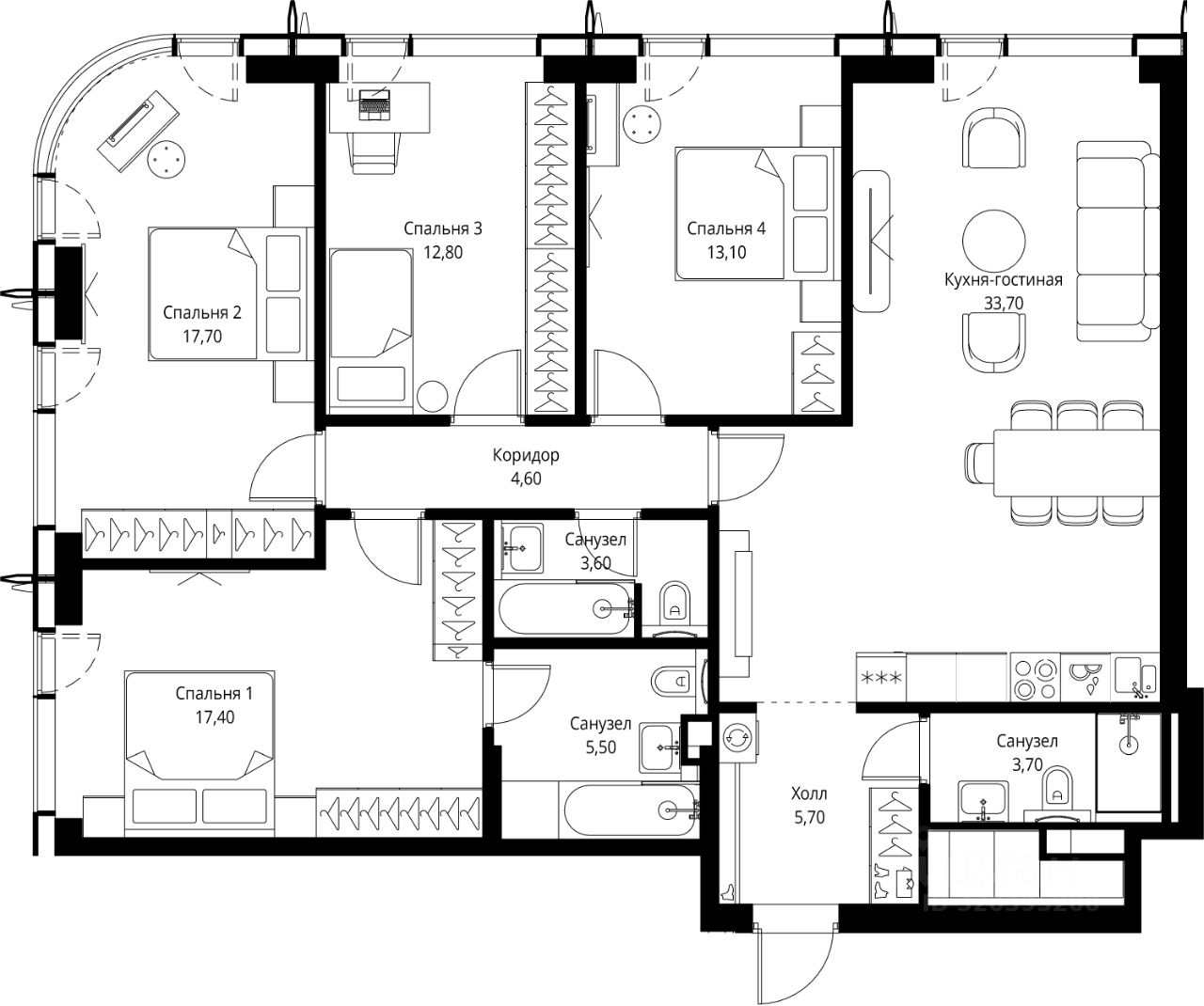 Продаётся 4-комнатная квартира общей площадью 117.80 м² без отделки в ЖК Сити Бэй, квартале Пасифик, на 57-м этаже 59 этажного дома.