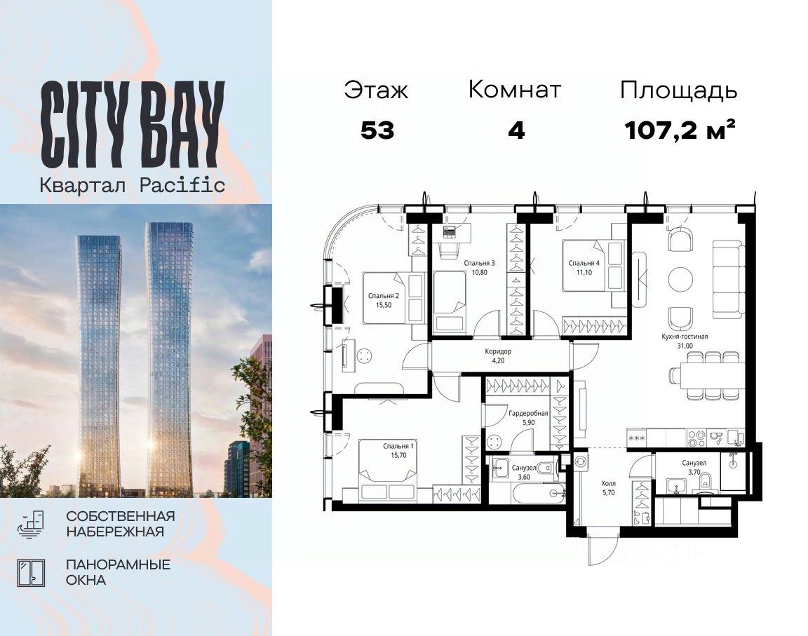 Продаётся 4-комнатная квартира общей площадью 107.20 м² без отделки в ЖК City Вау, квартале Pacific, на 53-м этаже 59 этажного дома.