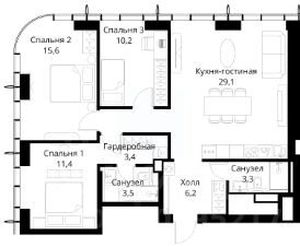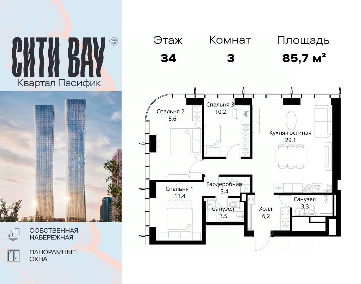Продаётся 3-комнатная квартира общей площадью 85.70 м² без отделки в ЖК Сити Бэй, квартале Пасифик, на 34-м этаже 59 этажного дома.
