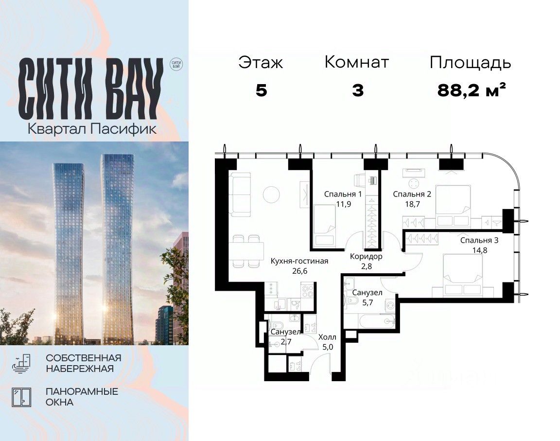 Продаётся 3-комнатная квартира общей площадью 88.20 м² без отделки в ЖК Сити Бэй, квартале Пасифик, на 5-м этаже 59 этажного дома.