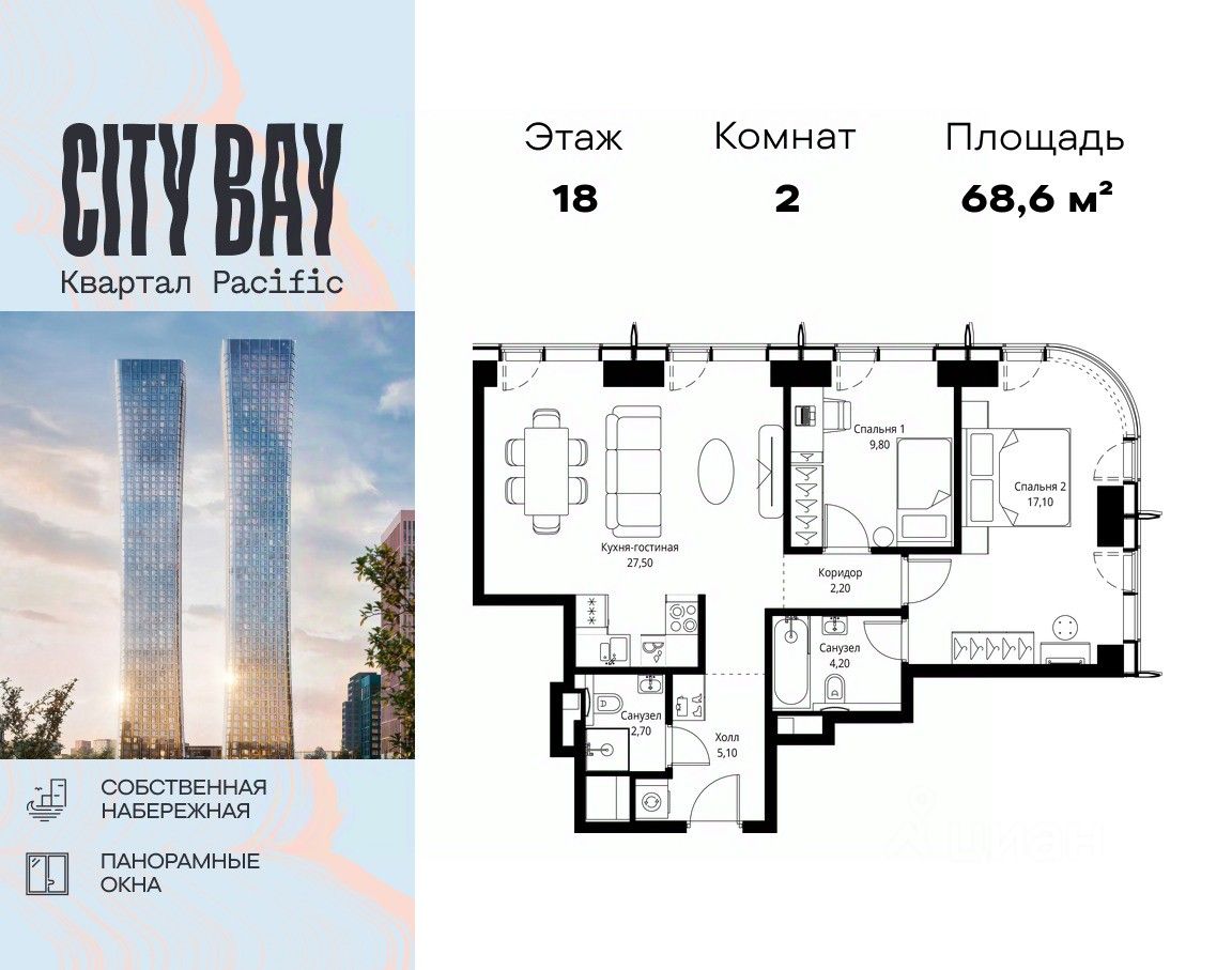 Продаётся 2-комнатная квартира общей площадью 68.60 м² без отделки в ЖК City Вау, квартале Pacific, на 18-м этаже 59 этажного дома.