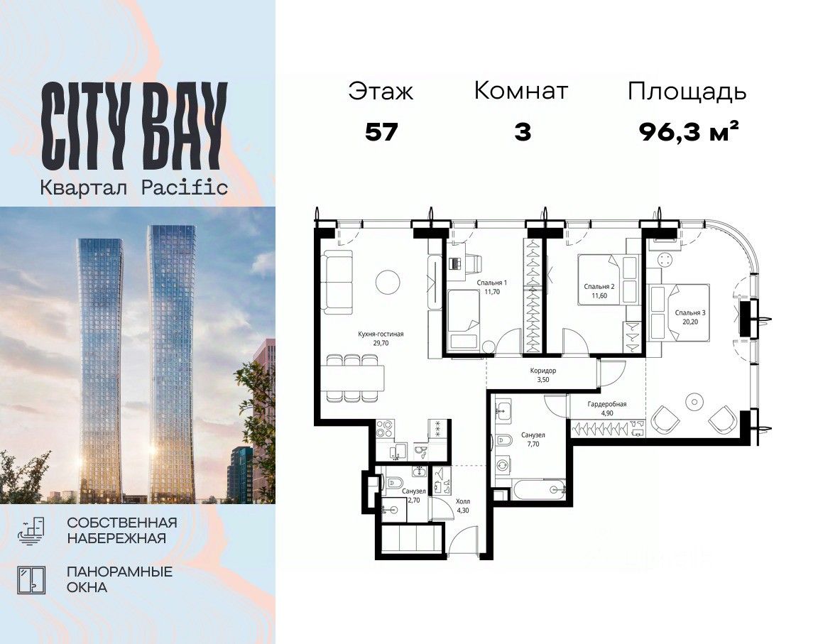 Продаётся 3-комнатная квартира общей площадью 96.30 м² без отделки в ЖК City Вау, квартале Pacific, на 57-м этаже 59 этажного дома.