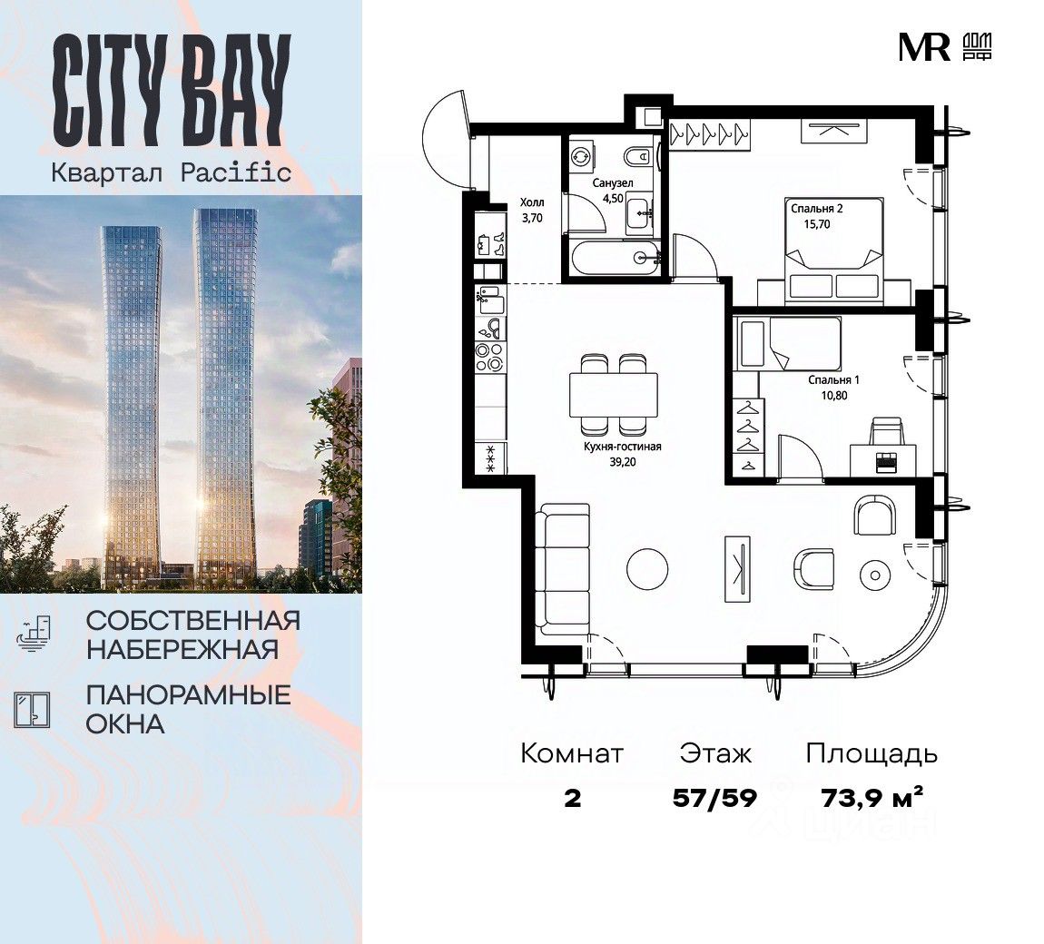 Продаётся 2-к квартира общей площадью 73.90 м² без отделки в ЖК City Вау, квартале Pacific, на 57-м этаже 59 этажного дома.