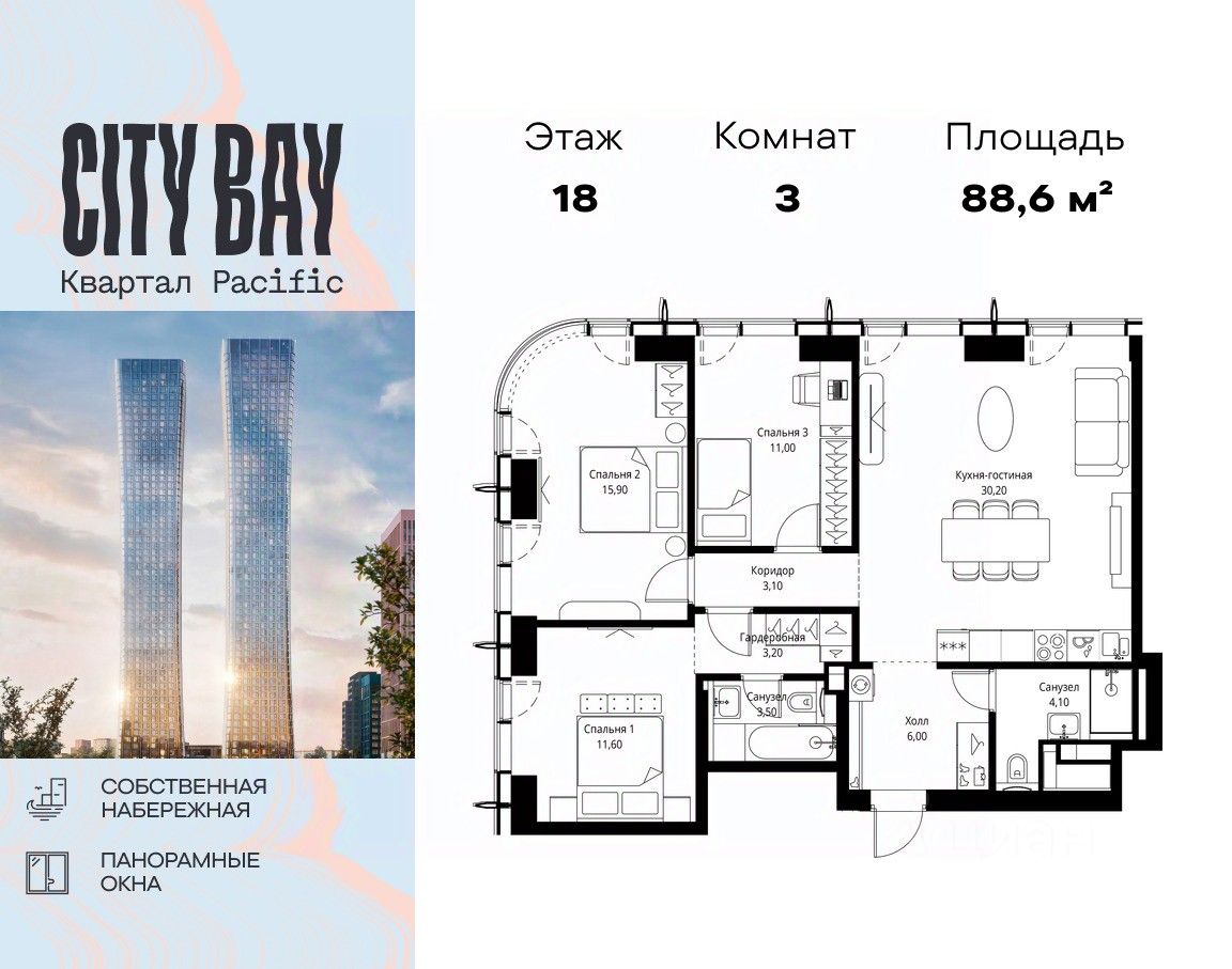 Продаётся 3-комнатная квартира общей площадью 88.60 м² без отделки в ЖК City Вау, квартале Pacific, на 18-м этаже 59 этажного дома.