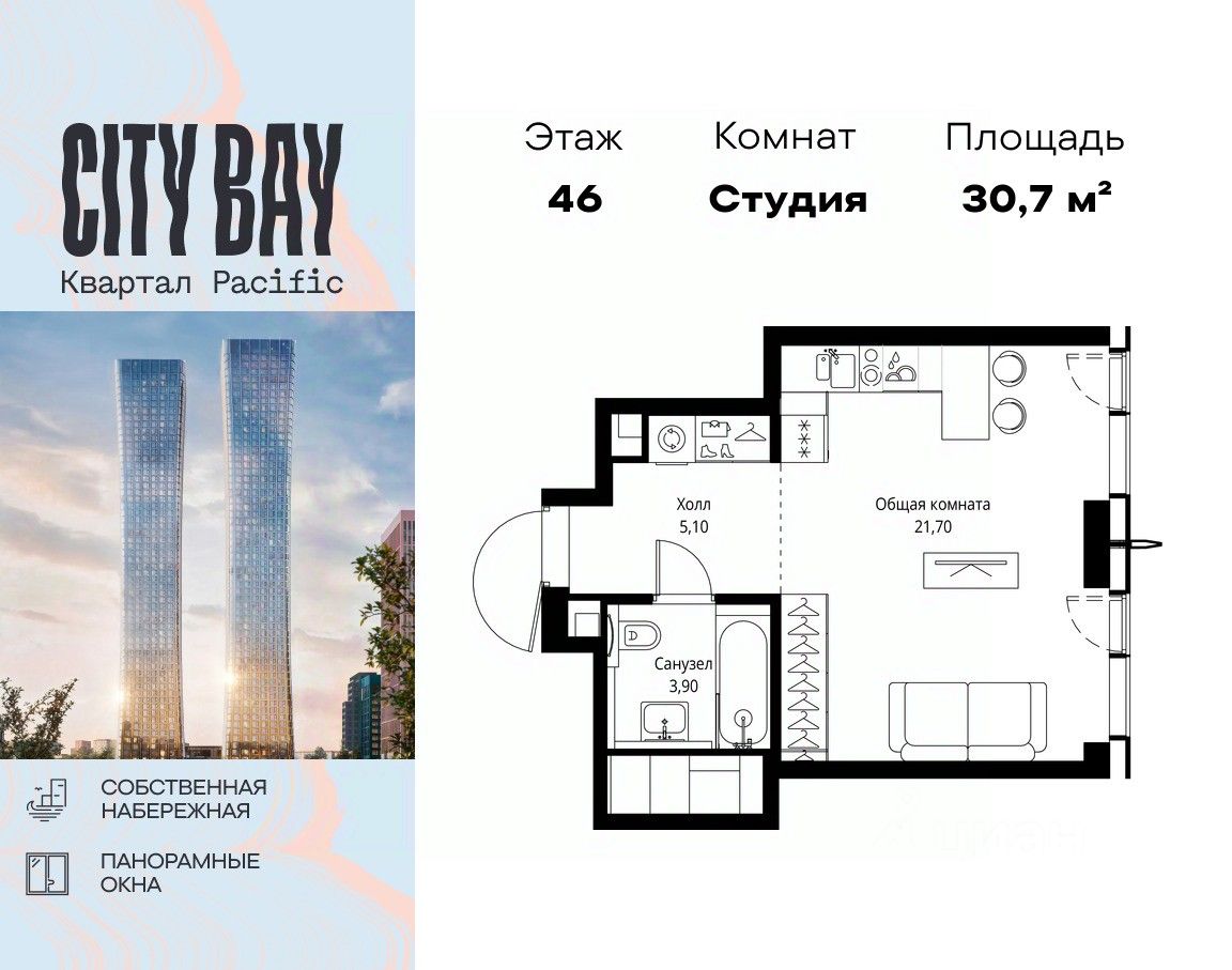 Продаётся студия общей площадью 30.70 м² без отделки в ЖК City Вау, квартале Pacific, на 46-м этаже 59 этажного дома.