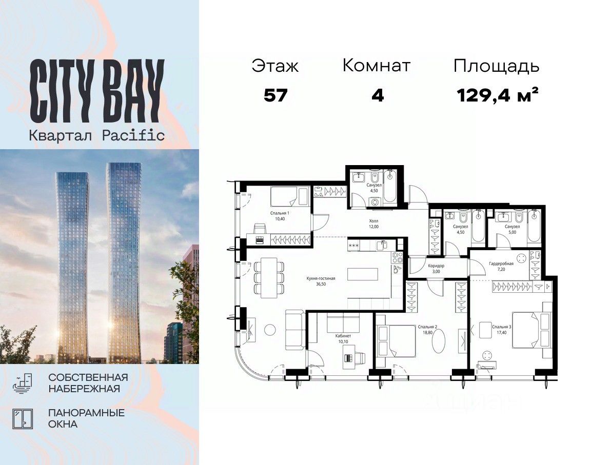 Продаётся 4-комнатная квартира общей площадью 129.40 м² без отделки в ЖК City Вау, квартале Pacific, на 57-м этаже 59 этажного дома.