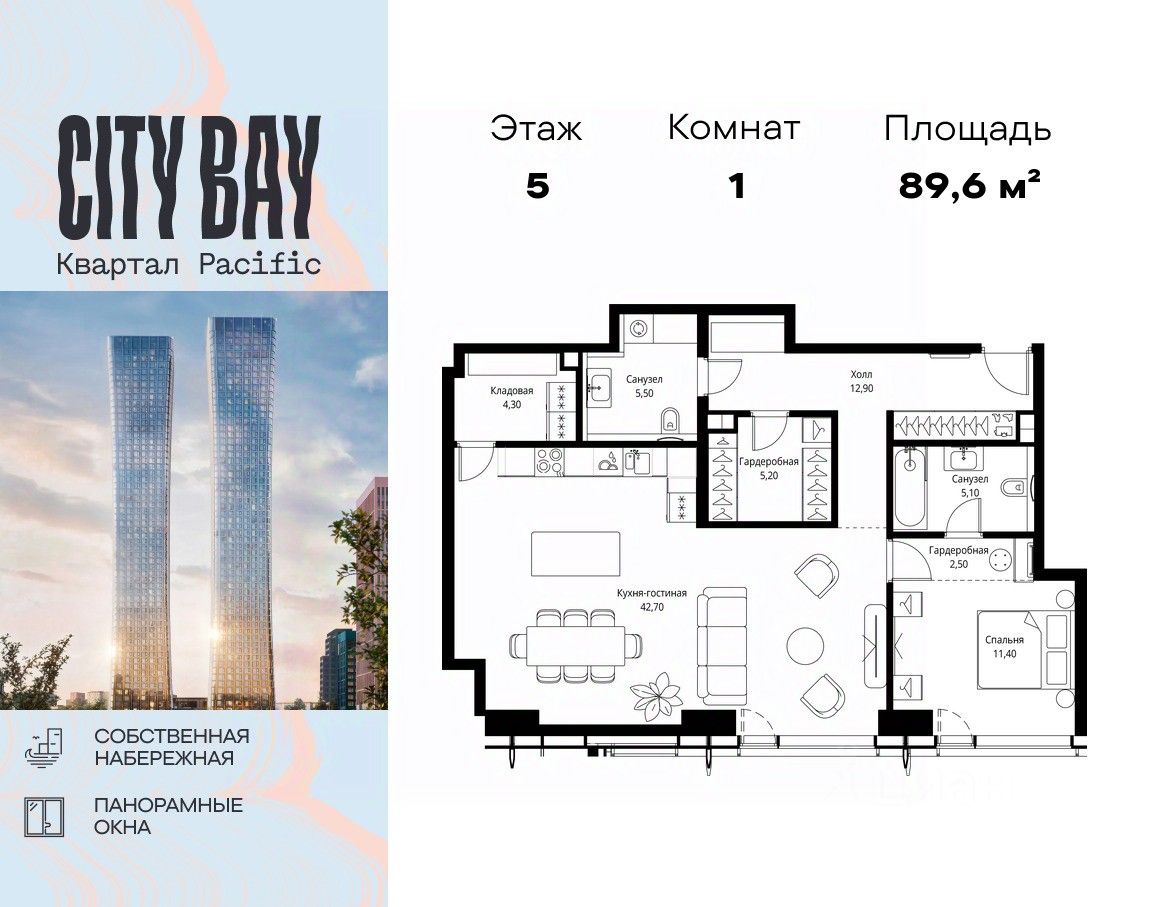 Продаётся 1-комнатная квартира общей площадью 89.60 м² без отделки в ЖК City Вау, квартале Pacific, на 5-м этаже 59 этажного дома.