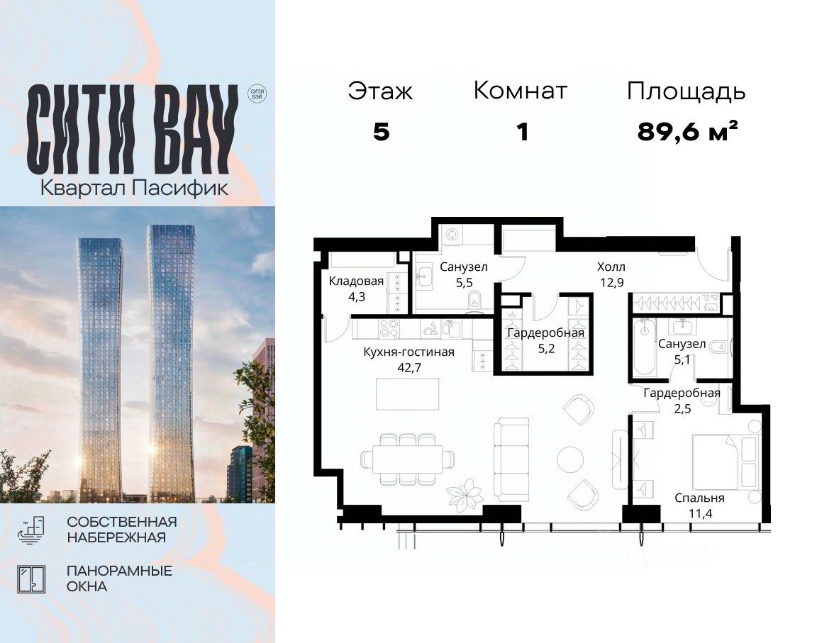 Продаётся 1-комнатная квартира общей площадью 89.60 м² без отделки в ЖК Сити Бэй, квартале Пасифик, на 5-м этаже 59 этажного дома.
