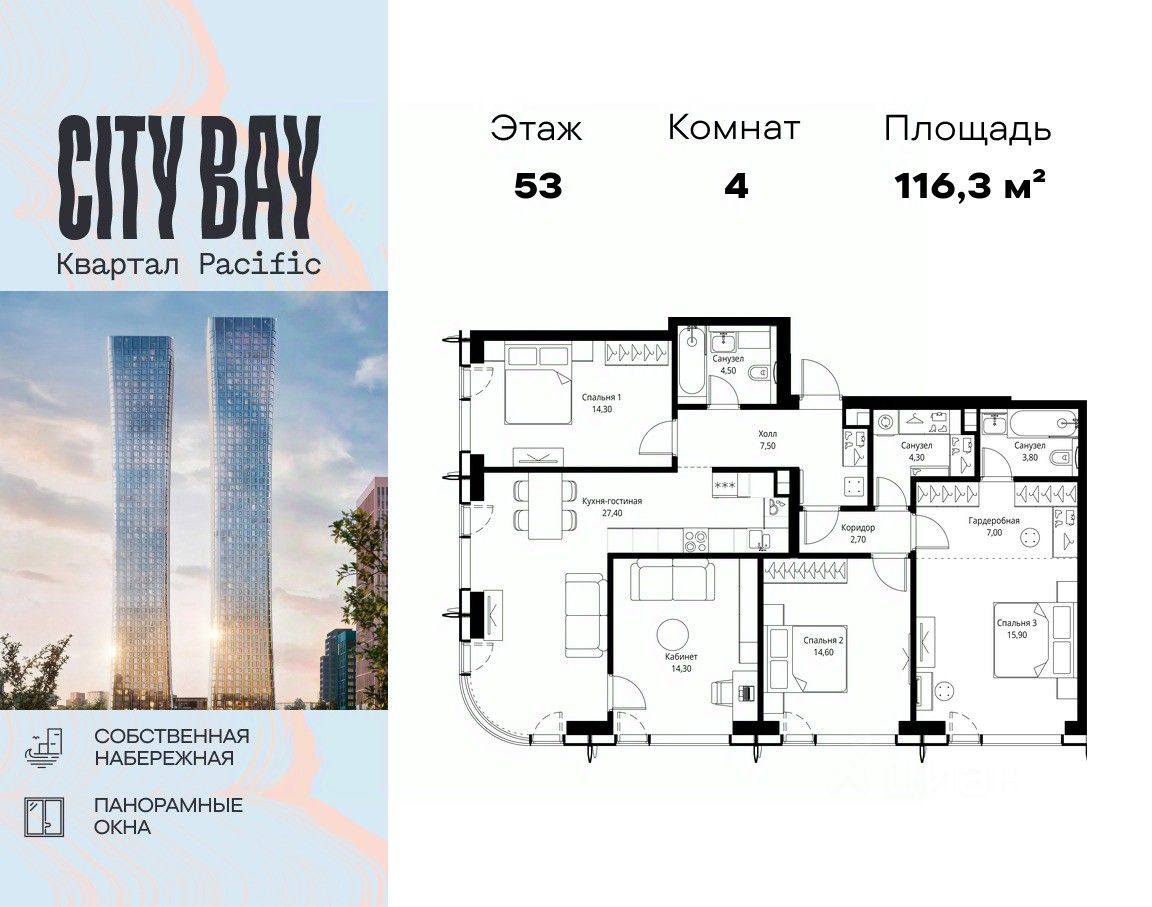 Продаётся 4-комнатная квартира общей площадью 116.30 м² без отделки в ЖК City Вау, квартале Pacific, на 53-м этаже 59 этажного дома.