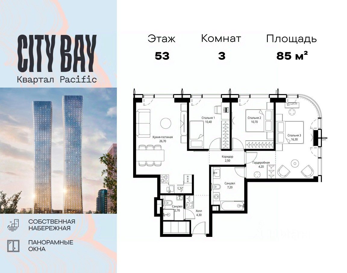 Продаётся 3-комнатная квартира общей площадью 85 м² без отделки в ЖК City Вау, квартале Pacific, на 53-м этаже 59 этажного дома.