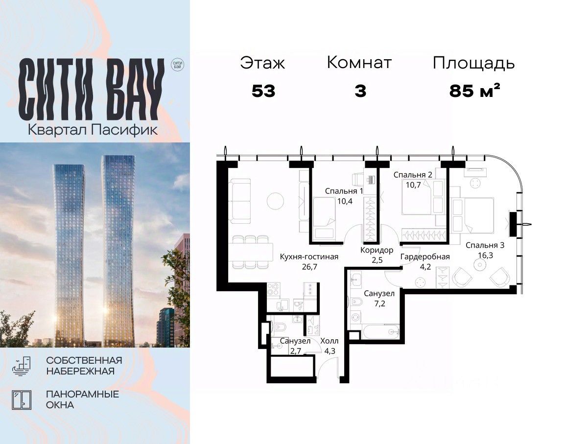 Продаётся 3-комнатная квартира общей площадью 85 м² без отделки в ЖК Сити Бэй, квартале Пасифик, на 53-м этаже 59 этажного дома.